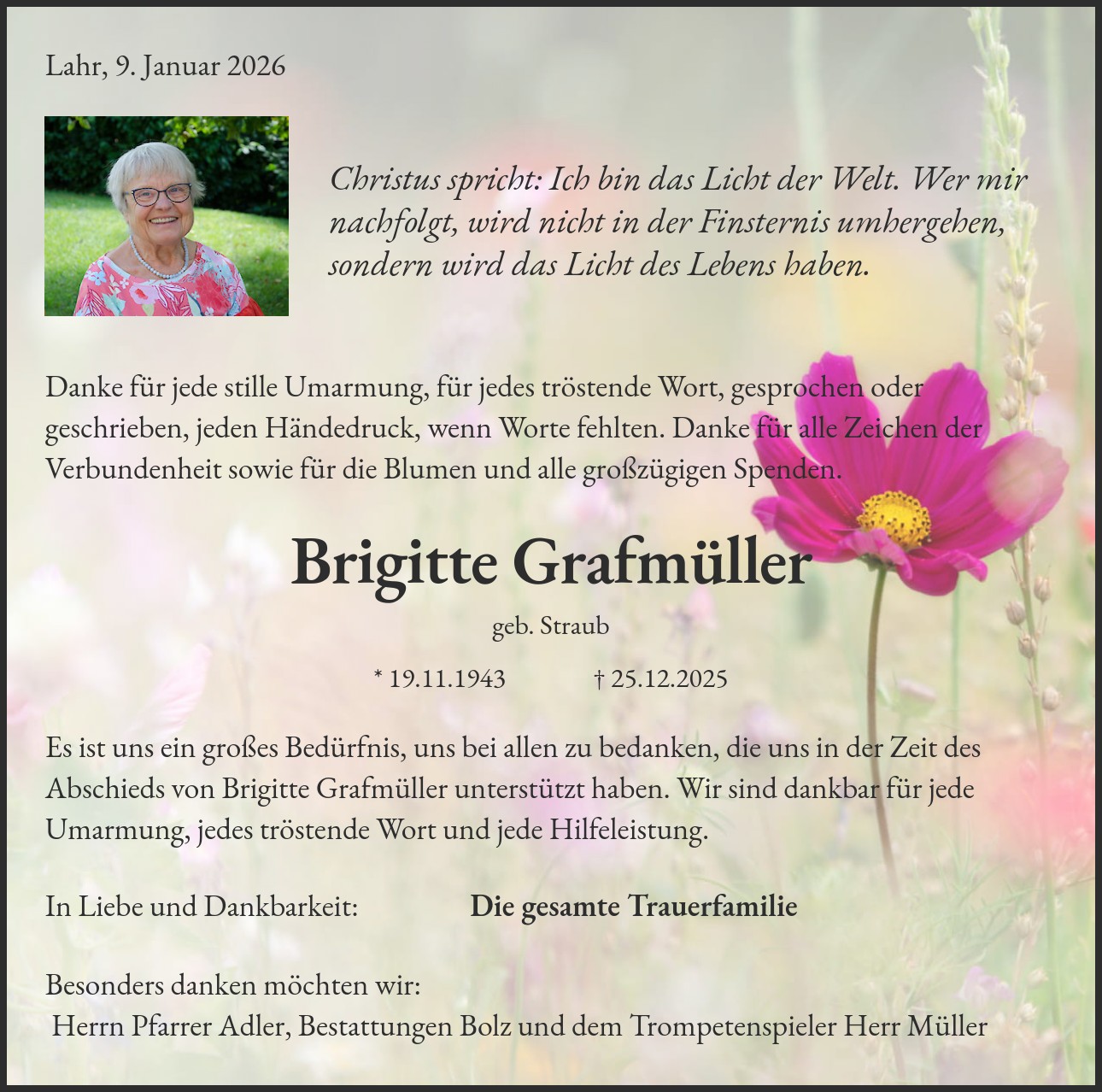 Es ist uns ein großes Bedürfnis, uns bei allen zu bedanken, die uns in der Zeit des Abschieds von Brigitte Grafmüller unterstützt haben. Wir sind dankbar für jede Umarmung, jedes tröstende Wort und jede Hilfeleistung.