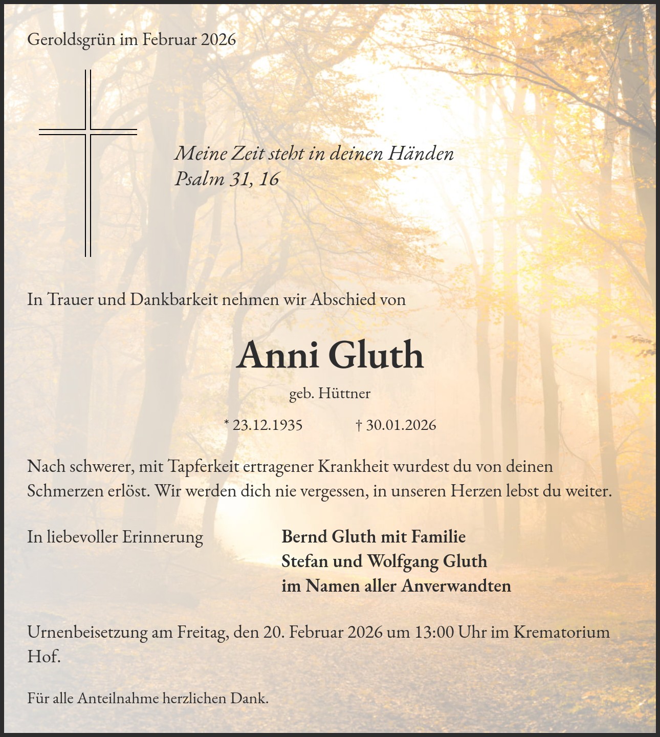 Urnenbeisetzung am Freitag, den 20. Februar 2026 um 13:00 Uhr im Krematorium Hof.