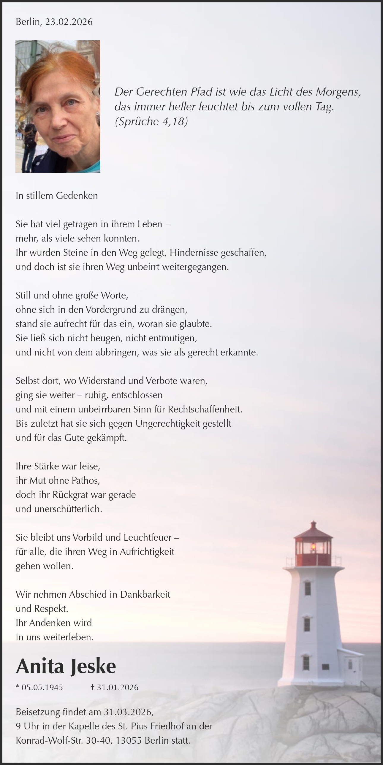 Beisetzung findet am 31.03.2026, 9 Uhr in der Kapelle des St. Pius Friedhof an der Konrad-Wolf-Str. 30-40, 13055 Berlin statt.