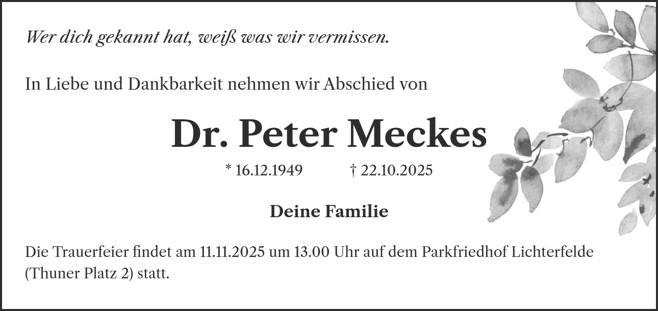 Die Trauerfeier findet am 11.11.2025 um 13.00 Uhr auf dem Parkfriedhof Lichterfelde (Thuner Platz 2) statt.