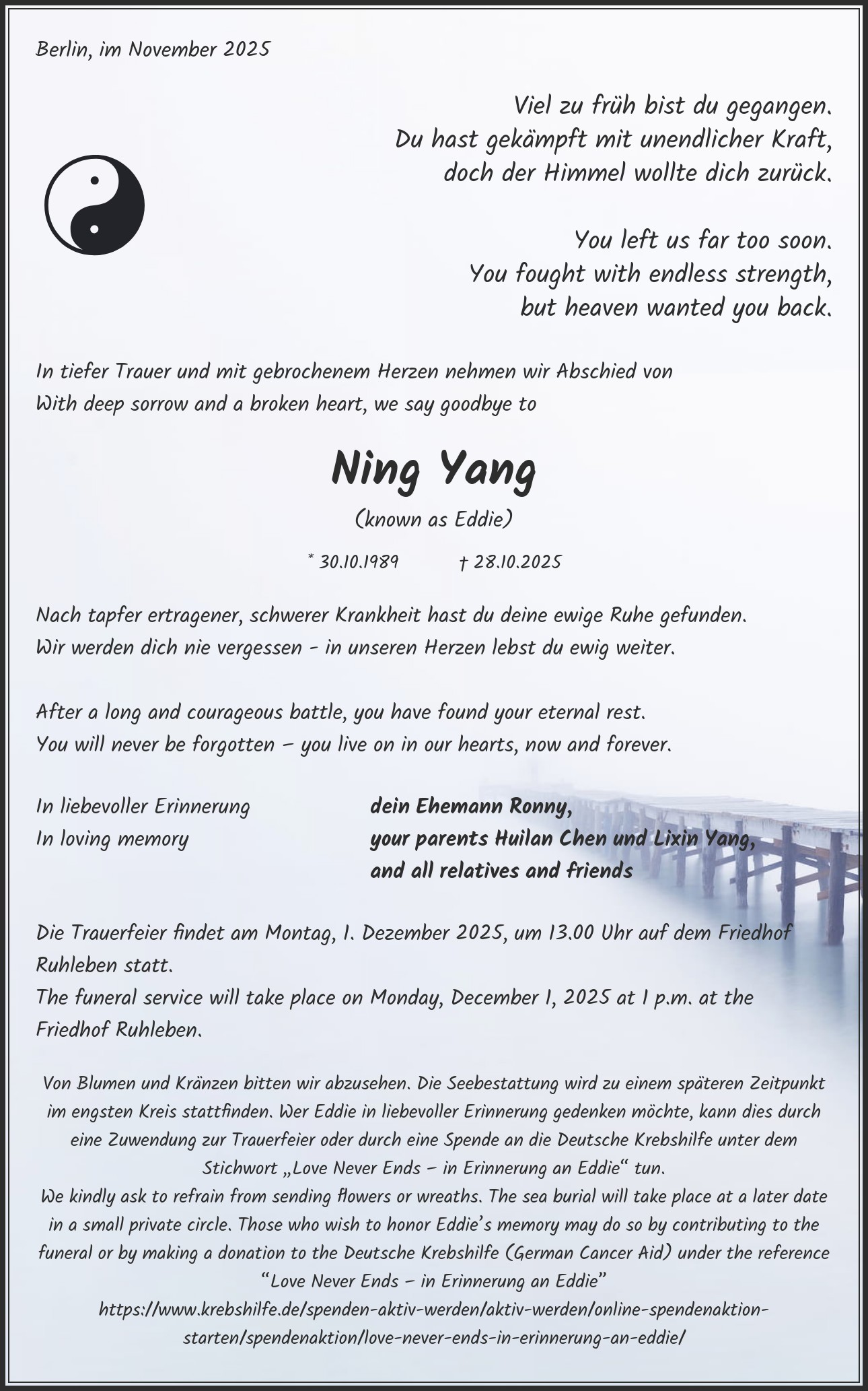 Die Trauerfeier findet am Montag, 1. Dezember 2025, um 13.00 Uhr auf dem Friedhof Ruhleben statt. The funeral service will take place on Monday, December 1, 2025 at 1 p.m. at the Friedhof Ruhleben.