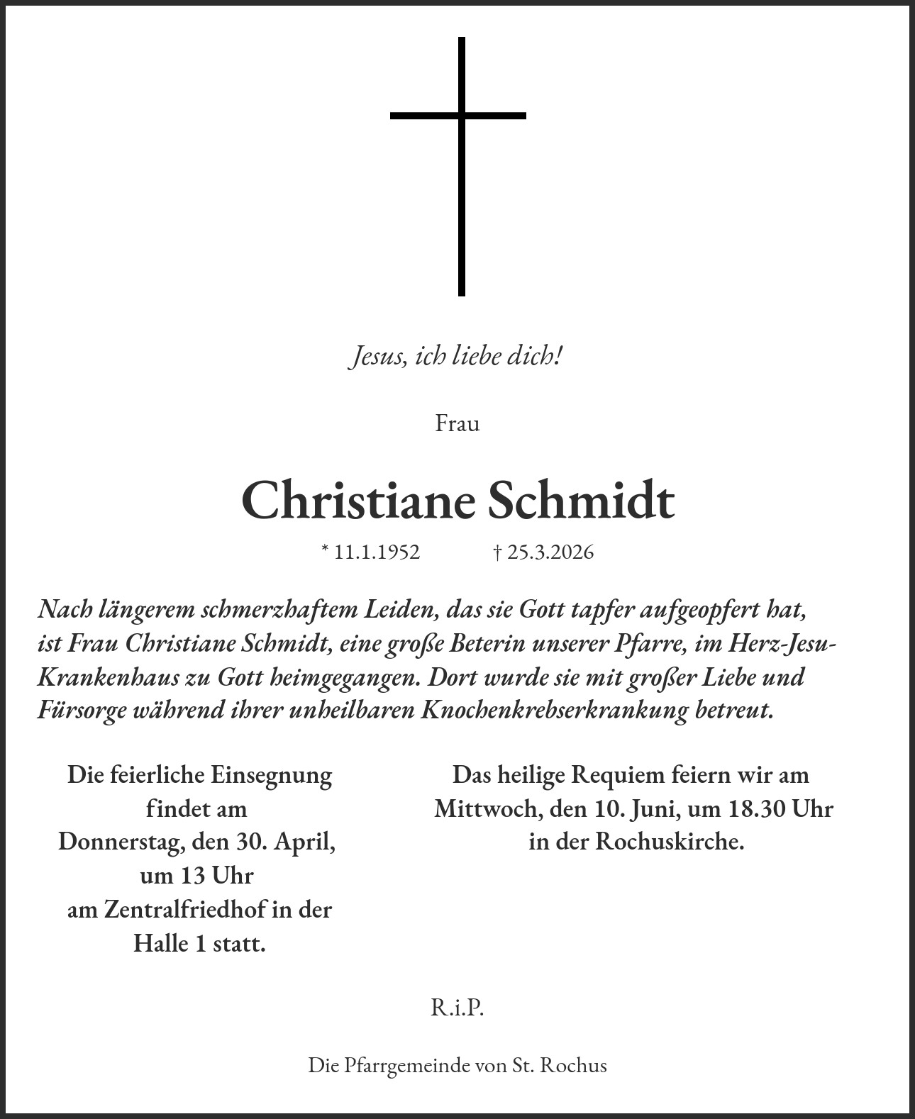 Nach längerem schmerzhaftem Leiden, das sie Gott tapfer aufgeopfert hat, ist Frau Christiane Schmidt, eine große Beterin unserer Pfarre, im Herz-Jesu-Krankenhaus zu Gott heimgegangen. Dort wurde sie mit großer Liebe und Fürsorge während ihrer unheilbaren Knochenkrebserkrankung betreut.