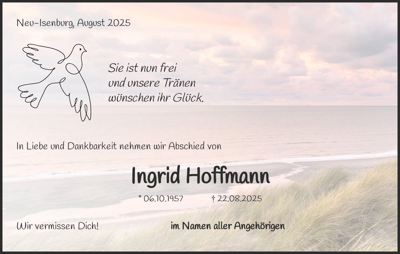 Mit der Eröffnung des Weltladens lernte ich Ingrid Hoffman kennen. Sie war für mich eine klar denkende, zuverlässige und kompetente Mitarbeiterin. Das Schicksal hat sie nicht verwöhnt und sie versuchte dennoch, gut zurecht zu kommen. Ich glaube, dass sie schließlich nicht mehr die Kraft hatte, all ihre Probleme zu bewältigen. Liebe Ingrid, ich hoffe, Du hast nun Ruhe und Frieden gefunden. Ich werde immer gerne an Dich denken.
