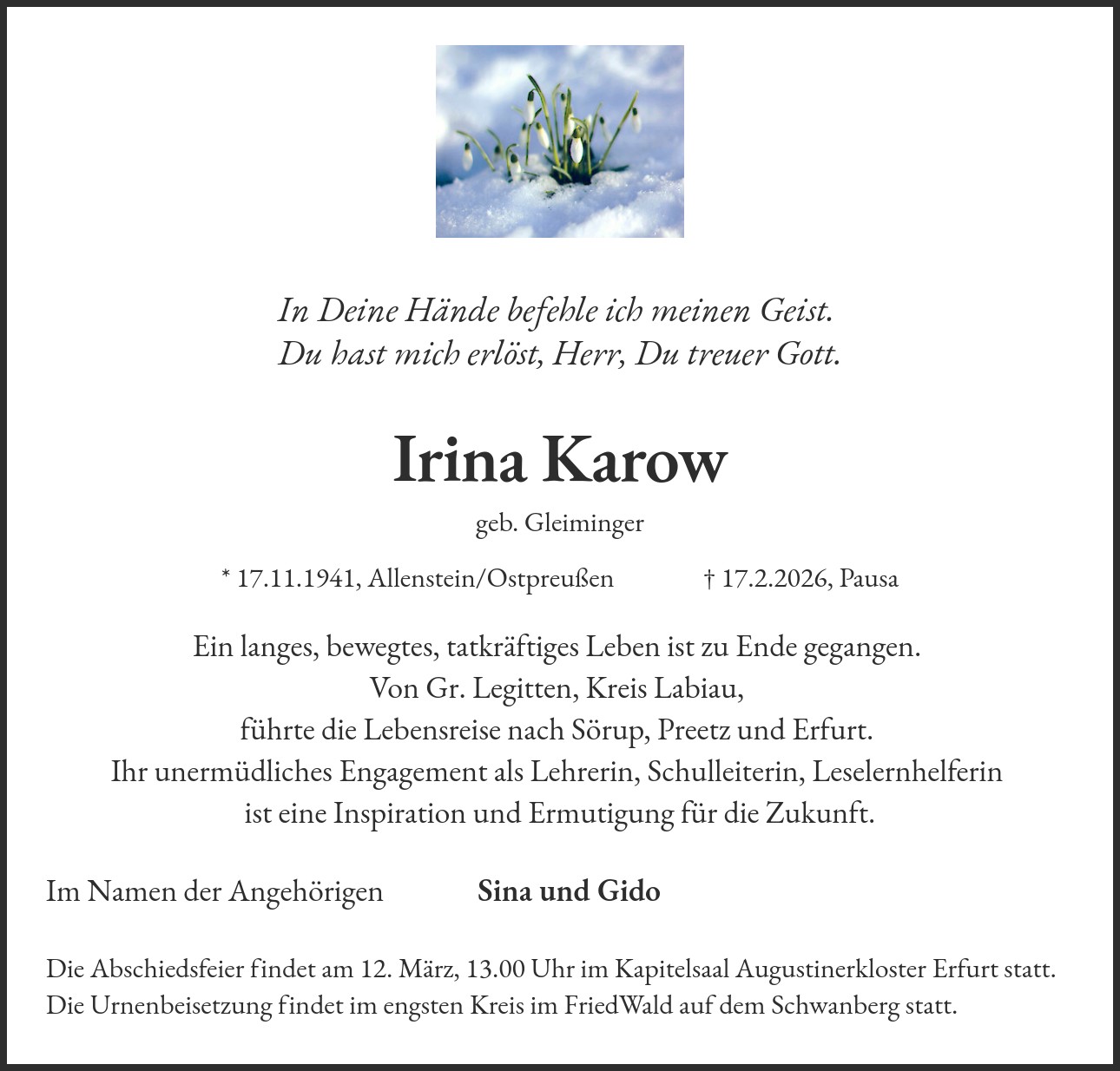 * 17.11.1941, Allenstein/Ostpreußen † 17.2.2026, Pausa