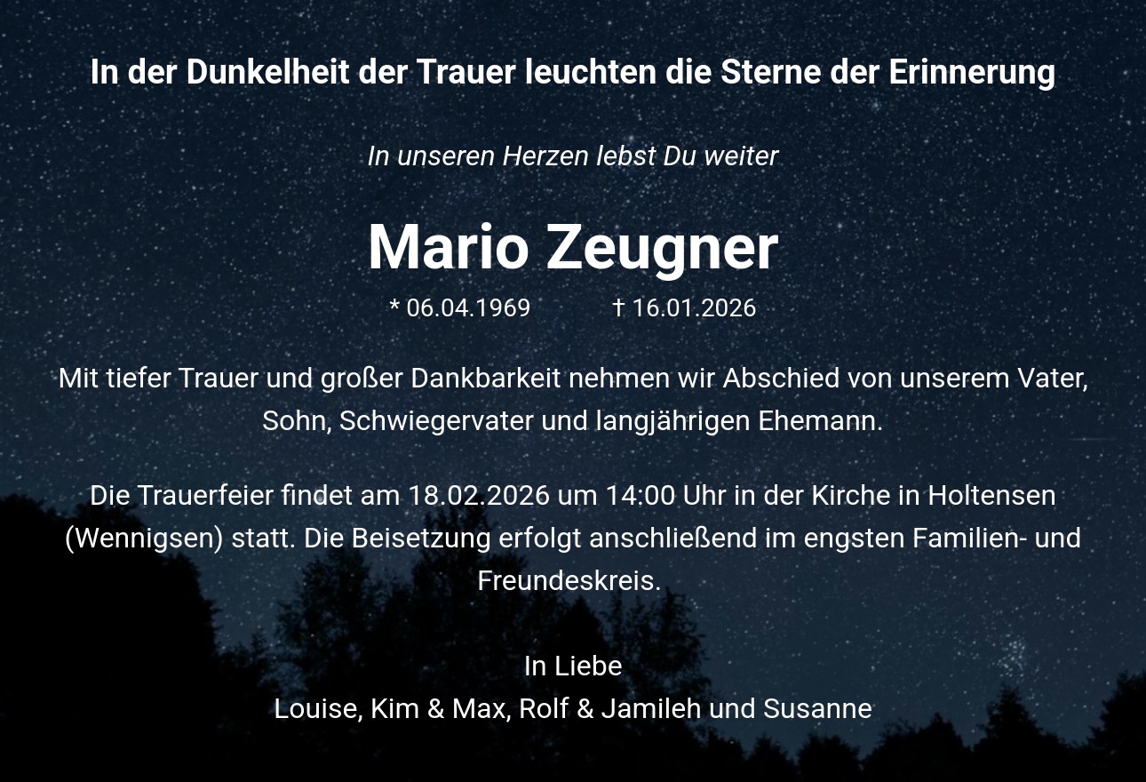 Die Trauerfeier findet am 18.02.2026 um 14:00 Uhr in der Kirche in Holtensen (Wennigsen) statt. Die Beisetzung erfolgt anschließend im engsten Familien- und Freundeskreis. In Liebe Louise, Kim & Max, Rolf & Jamileh und Susanne