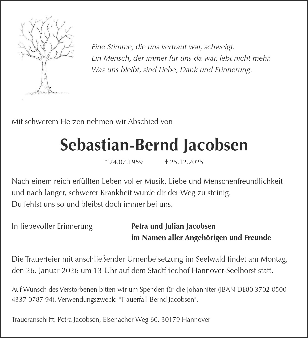 Auf Wunsch des Verstorbenen bitten wir um Spenden für die Johanniter (IBAN DE80 3702 0500 4337 0787 94), Verwendungszweck: "Trauerfall Bernd Jacobsen". Traueranschrift: Petra Jacobsen, Eisenacher Weg 60, 30179 Hannover