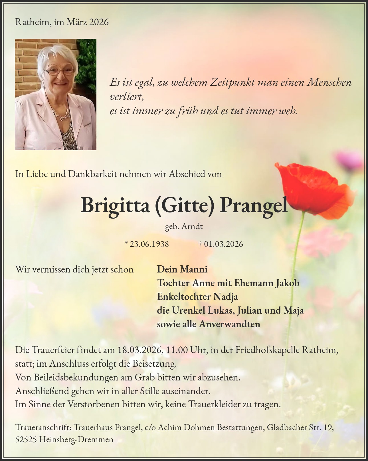 Traueranschrift: Trauerhaus Prangel, c/o Achim Dohmen Bestattungen, Gladbacher Str. 19, 52525 Heinsberg-Dremmen