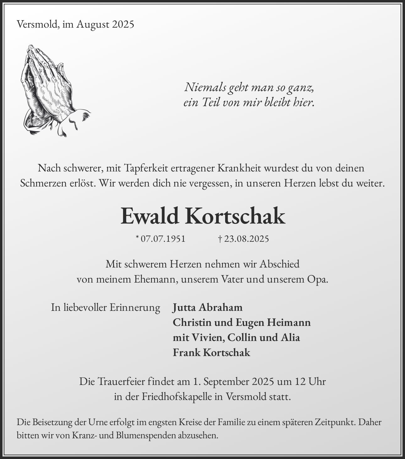 Die Trauerfeier findet am 1. September 2025 um 12 Uhr in der Friedhofskapelle in Versmold statt.