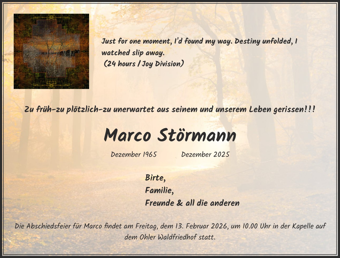 Die Abschiedsfeier für Marco findet am Freitag, dem 13. Februar 2026, um 10.00 Uhr in der Kapelle auf dem Ohler Waldfriedhof statt.
