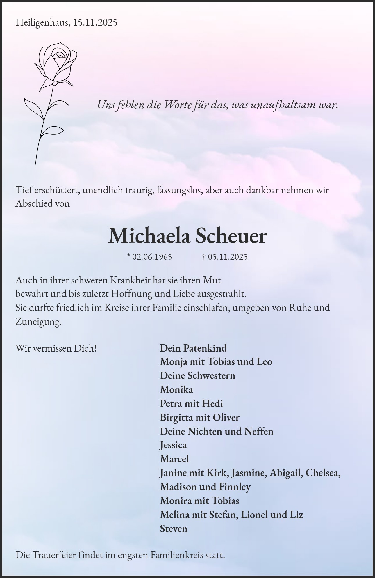 Deine Freundschaft war Engelhaft. Und als dieser hast du uns am 05.11.2025 für immer verlassen 😪😪 Der Schmerz sitzt tief und die Trauer über deinen Verlust ist Grenzenlos 😪 Trost ist, zu Wissen das du oben im Himmel nie wieder Schmerzen ertragen musst. ❣️❣️Für immer in unseren Herzen ❣️❣️ 🙏🙏🙏 Ruhe in Frieden liebe Michaela 🙏🙏🙏 Deine Marion - Deine Barbara - meine Mama und all die anderen die dich lieb hatten 🌹🌹🌹🌹🌹🌹 -