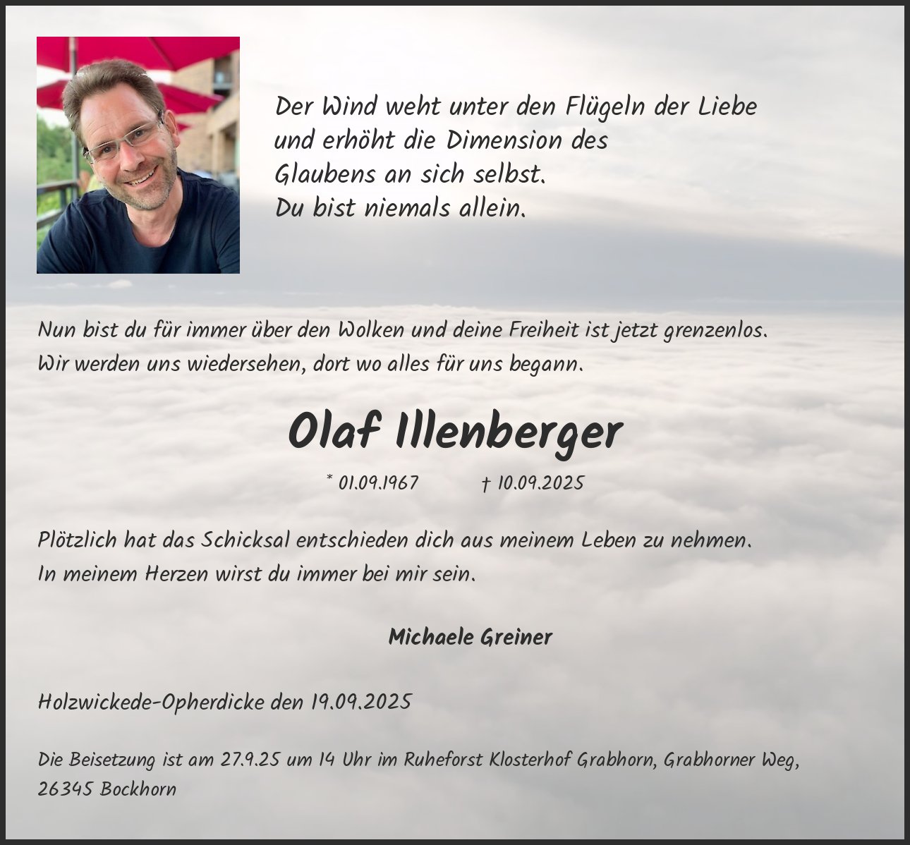 Die Beisetzung ist am 27.9.25 um 14 Uhr im Ruheforst Klosterhof Grabhorn, Grabhorner Weg, 26345 Bockhorn