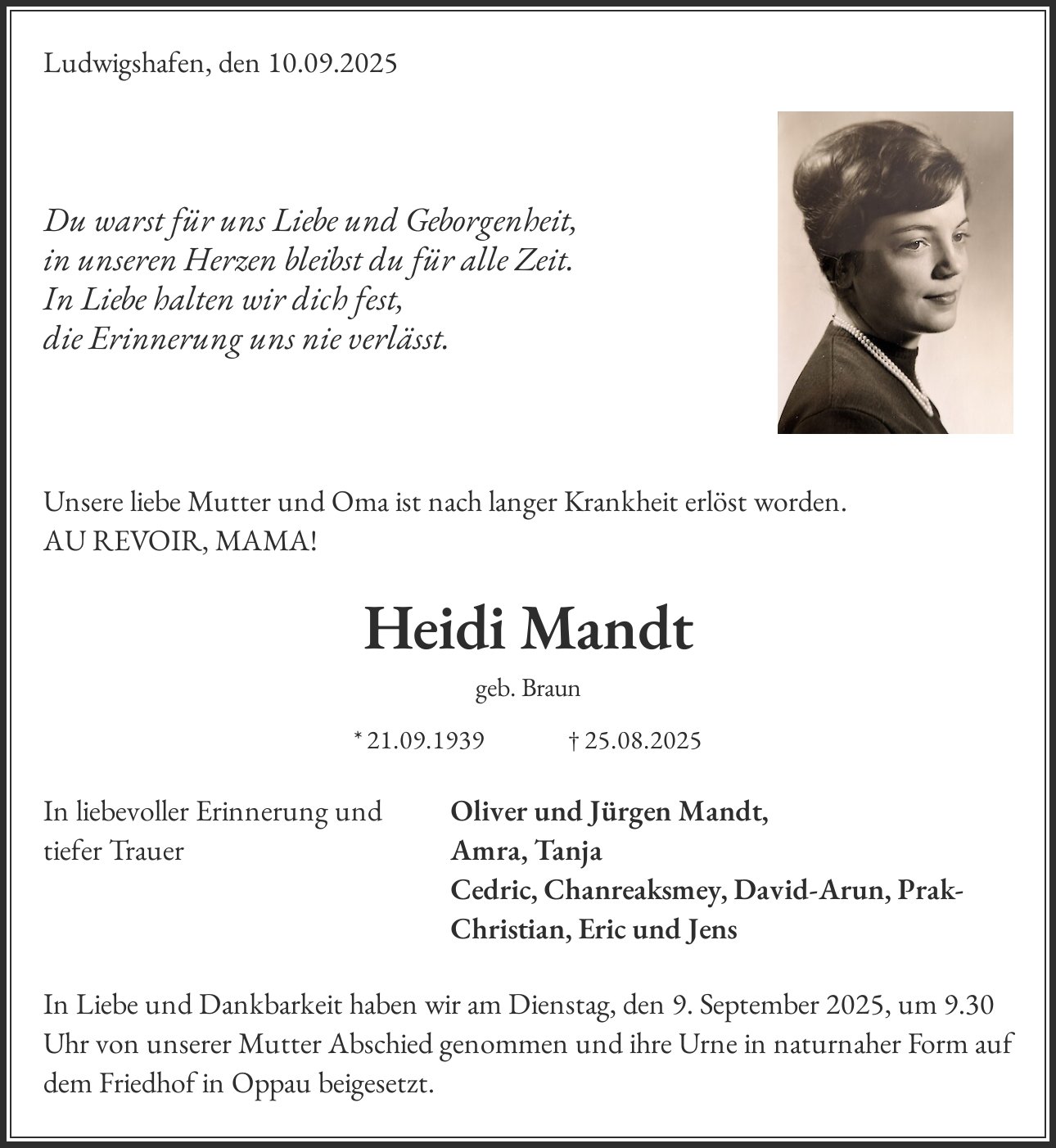 In Liebe und Dankbarkeit haben wir am Dienstag, den 9. September 2025, um 9.30 Uhr von unserer Mutter Abschied genommen und ihre Urne in naturnaher Form auf dem Friedhof in Oppau beigesetzt.