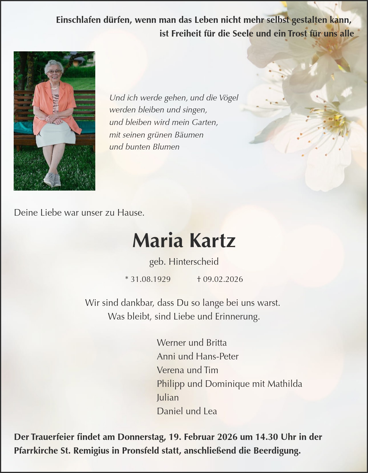 Der Trauerfeier findet am Donnerstag, 19. Februar 2026 um 14.30 Uhr in der Pfarrkirche St. Remigius in Pronsfeld statt, anschließend die Beerdigung.