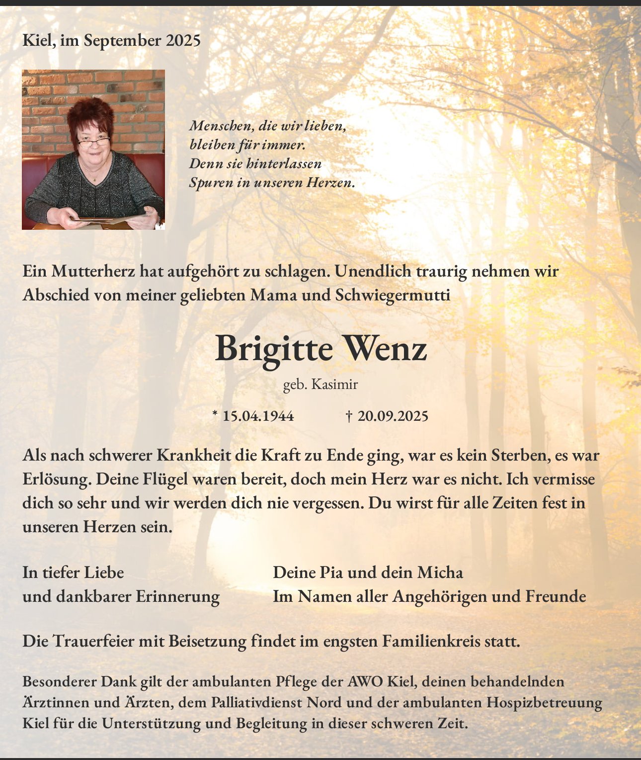 Besonderer Dank gilt der ambulanten Pflege der AWO Kiel, deinen behandelnden Ärztinnen und Ärzten, dem Palliativdienst Nord und der ambulanten Hospizbetreuung Kiel für die Unterstützung und Begleitung in dieser schweren Zeit.