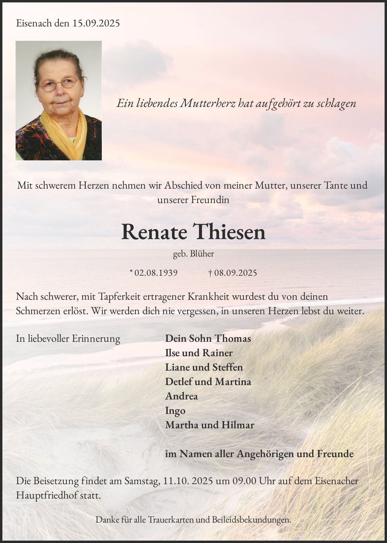 Die Beisetzung findet am Samstag, 11.10. 2025 um 09.00 Uhr auf dem Eisenacher Hauptfriedhof statt.
