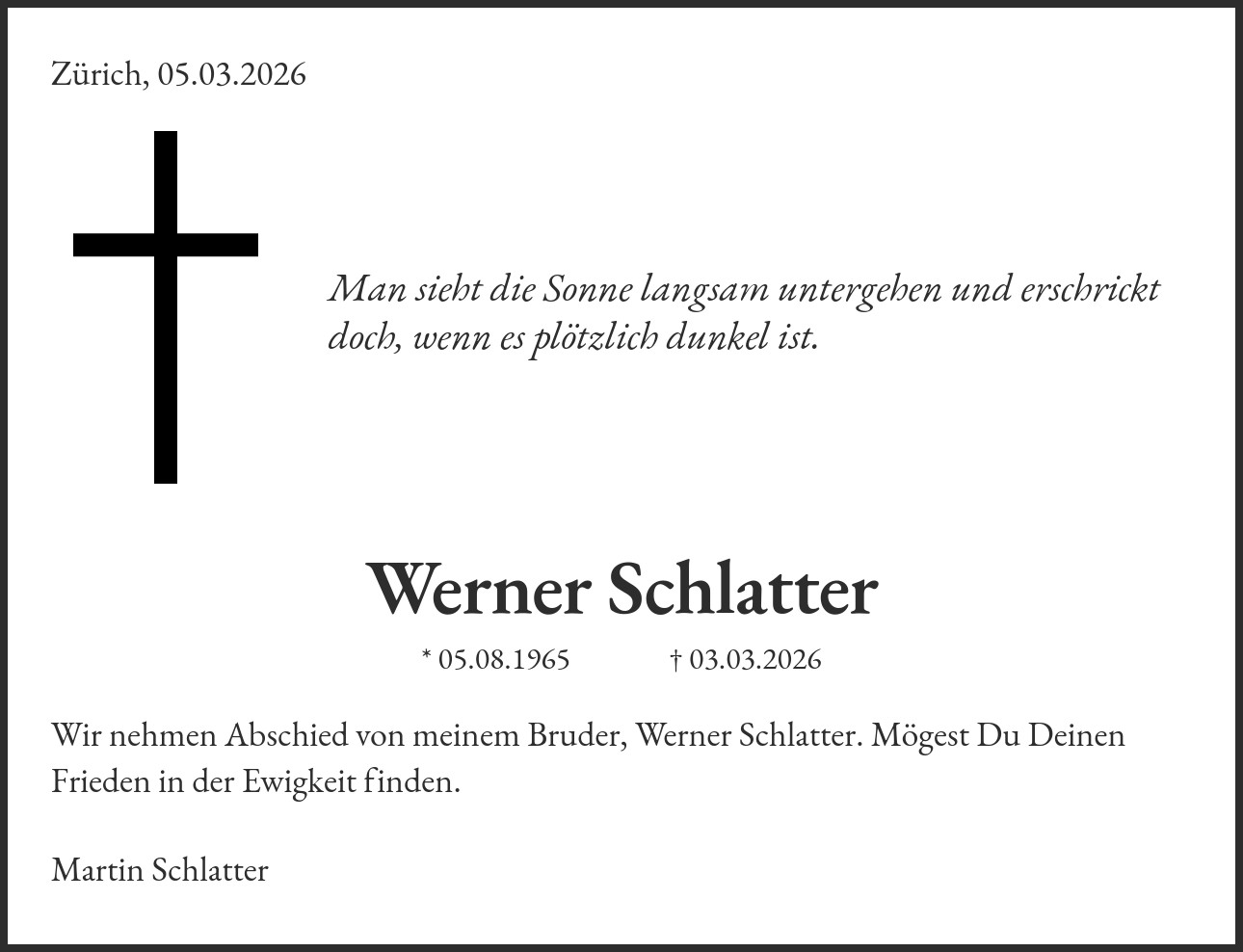 Wir nehmen Abschied von meinem Bruder, Werner Schlatter. Mögest Du Deinen Frieden in der Ewigkeit finden.